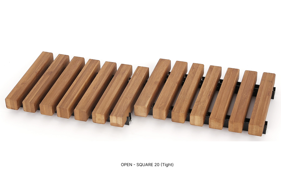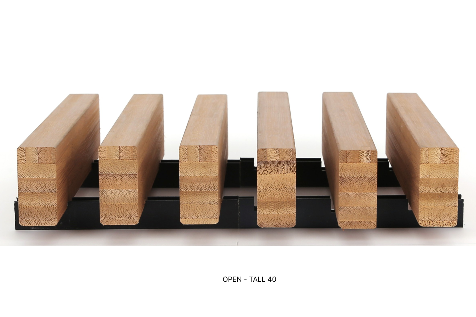CoreBOO™ OPEN SLAT Panels use bamboo slats fixed to an aluminum substrate that creates open spacing between each slat. This configuration allows visual transparency while maintaining rhythm and alignment. Ideal for applications requiring partial screening or depth, they deliver design flexibility with sustainable material integrity.